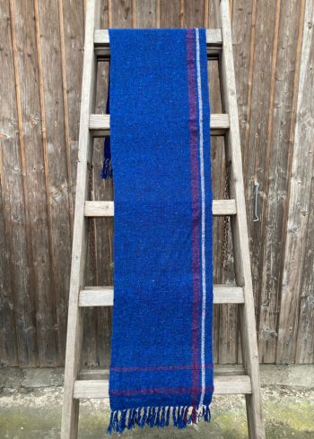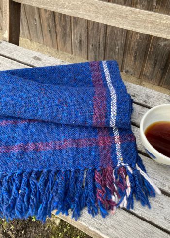 Dieser Schal besteht überwiegend aus kuschelweichem Merinotweedgarn in einem kräftigen Blau. Eingewebt sind kleine Streifen in dunkelviolett und einem hellen Tweedgarn mit den typischen bunten Farbtupfern.