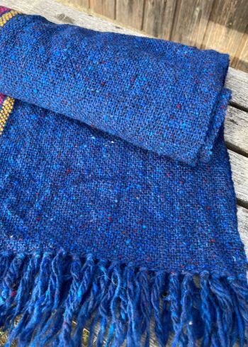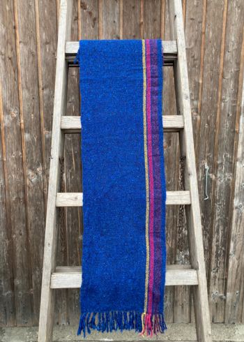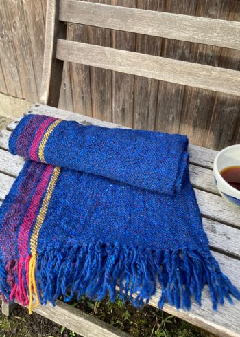 Diesen Schal habe ich aus blauem Tweedgarn (Merino) aus Irland gewebt – ganz ohne Querstreifen. Die Längstreifen in gelb, pink und violett machen gute Laune 🙂